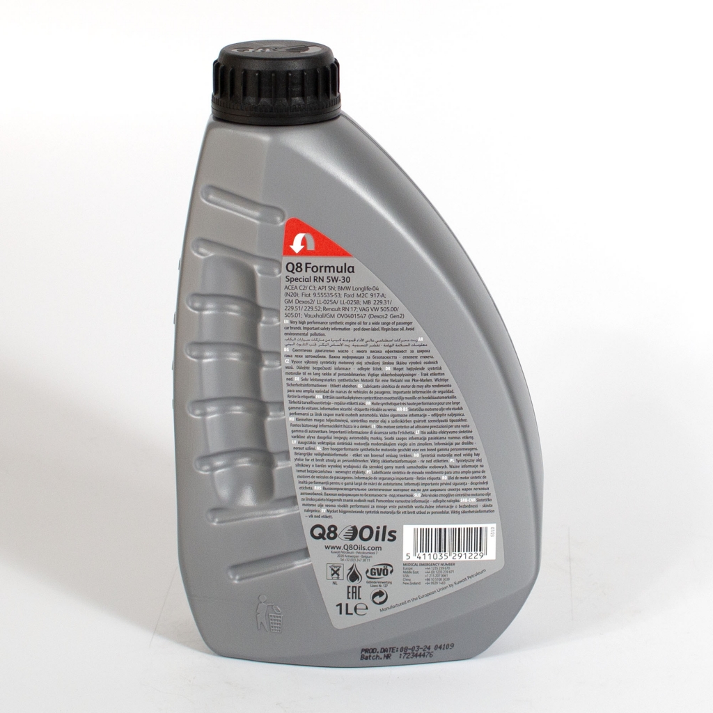 Q8 Formula Special RN 5W-30 – высокоэффективное моторное масло для легковых автомобилей. Обеспечивает превосходную защиту двигателя, способствует увеличению интервала замены масла и совместимо с системами дополнительной очистки выхлопных газов. Превосходит требования ACEA C3 и API SN и соответствует самым строгим требованиям всех ведущих производителей автомобилей.